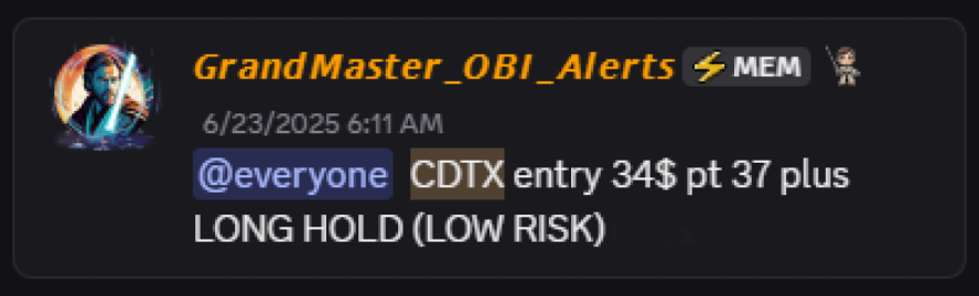 On June 23, 2025, Obi issued a long-term conviction call on Cidara Therapeutics (CDTX) at an entry price of $34, telling his community it was one of the few stocks he believed had multi-month upside potential.