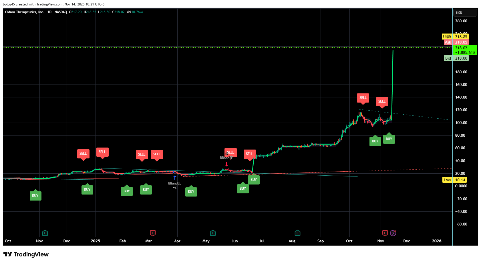 Today—November 14, 2025—CDTX exploded to a high of $218.85, representing a +543% gain from his original long-hold entry.