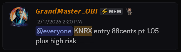 - $KNRX — Alerted 2/17/26 @ $0.88, high 2/19/26 @ $3.44 (+291%)