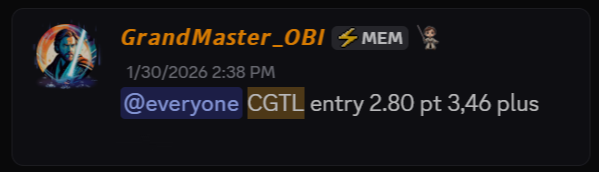 Back on January 30, 2026, Obi alerted Creative Global Technology (CGTL.US) in the same Discord community at an entry price of $2.80. Over the following days, CGTL steadily climbed, and by today, February 3, 2026, the stock has tagged an intraday high of $6.38.