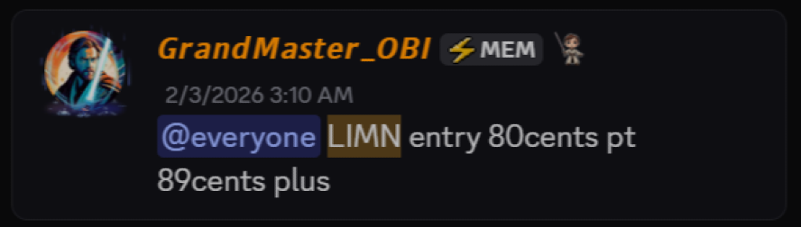 Liminatus Pharma (LIMN.US) has become the latest headline runner tied to Grandmaster-Obi after he alerted it in the Making Easy Money Discord on February 3, 2026 for $0.80.
