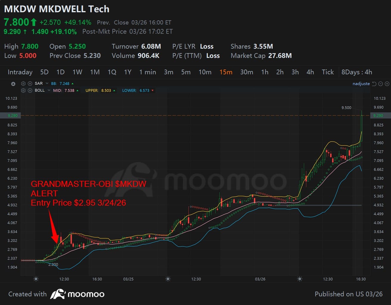 According to posts and shared alerts from the Making Easy Money Discord, GRANDMASTER-OBI alerted MKDWELL Tech (NASDAQ: MKDW) on March 24, 2026, at an entry price of just $2.95. By March 26, the stock surged to an intraday high of $7.88, marking a staggering gain of approximately 167% in less than 48 hours.