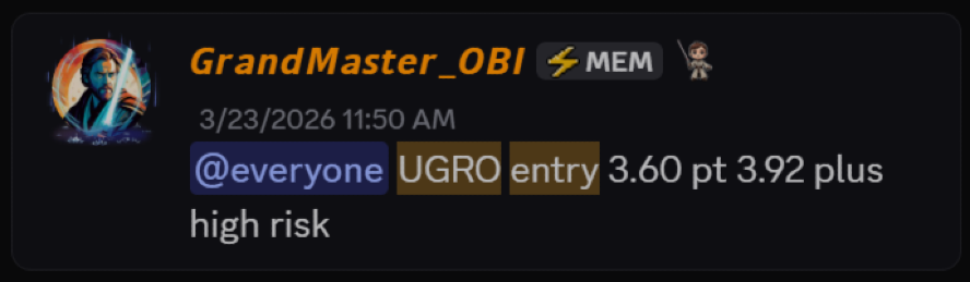 On March 23, 2026, inside the Making Easy Money Discord, Grandmaster-Obi alerted Urban-gro (UGRO.US) at an entry price of just: