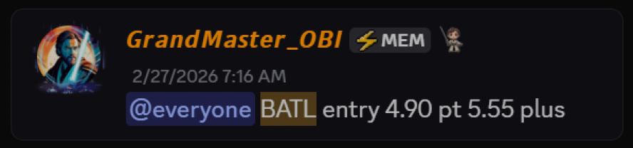 On February 27, 2026, GRANDMASTER-OBI alerted $BATL at an entry price of $4.90.