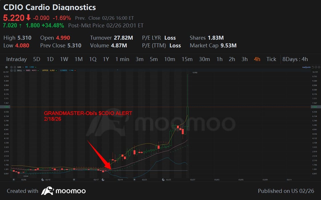 GRANDMASTER-OBI first alerted $CDIO on February 18, 2026, at an entry price of $1.43 inside the Making Easy Money Discord.