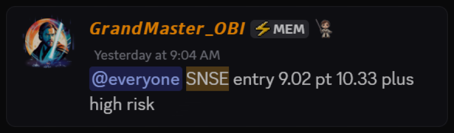 Also on February 17, 2026, Obi alerted Sensei Biotherapeutics (SNSE) at $9.02. By February 18, SNSE had ripped to a high of $36.95.