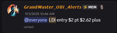 - LDI — alerted $2.00 (9/3) → peak $4.03 (9/8). ~+101%.