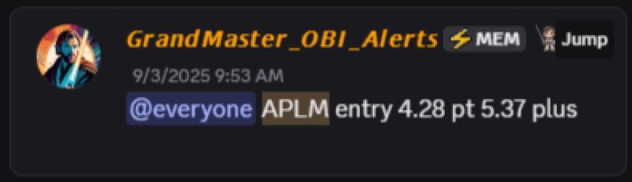 Less than two weeks before the PRAX rally, on September 3, 2025, OBI issued a buy alert on Apollomics ($APLM) with an entry price of $4.28.