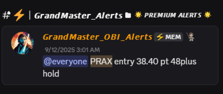 On September 12, 2025, Grandmaster-OBI alerted $PRAX at an entry price of $38.40.